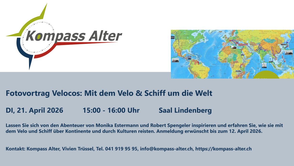 Der Fotovortrag Velocos: Mit dem Velo und Schiff um die Welt erzählt von Monika Estermann und Robert Spengeler wird durch Kompass Alter organisiert.