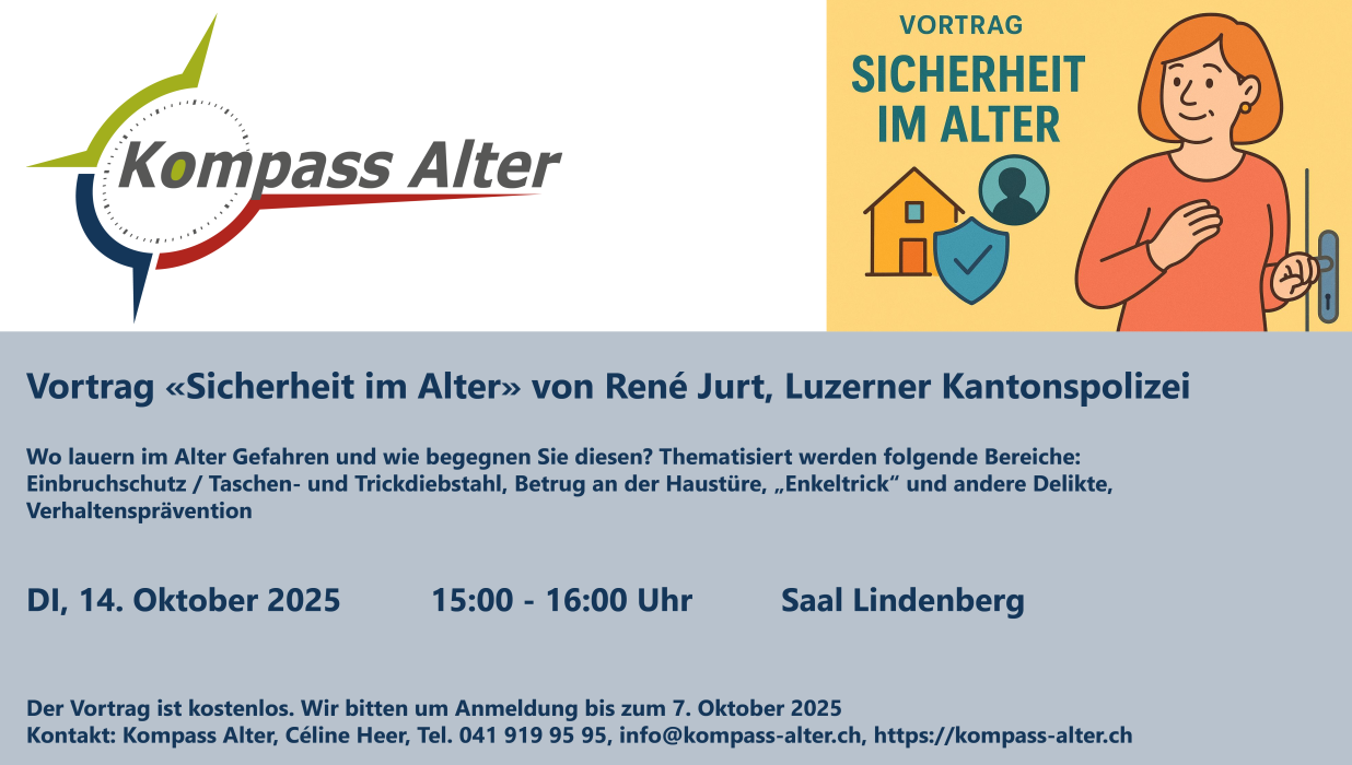 Der Vortrag "Sicherheit im Alter" durch René Jurt, Luzerner Kantonspolizei wird durch Kompass Alter organisiert.