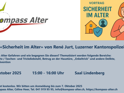 Der Vortrag "Sicherheit im Alter" durch René Jurt, Luzerner Kantonspolizei wird durch Kompass Alter organisiert.